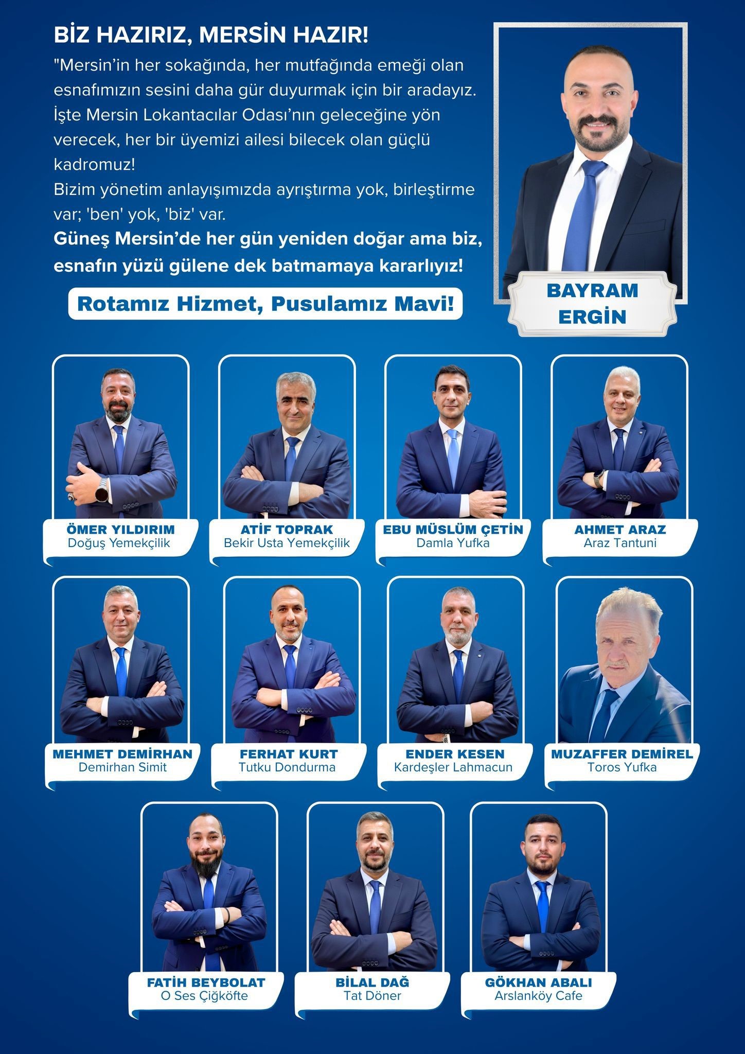 “Sektörümüzün geleceği için karar günü geldi! Artık bahanelere değil, çözüm odaklı bir iradeye ihtiyacımız var. Sizin emeğinizi, hakkınızı ve sofranızın bereketini korumak, odamızı şeffaf ve güçlü bir yönetime kavuşturmak için yola çıktık. Gelenekselleşmiş sorunları aşmak için kararlıyız, hazırız! Hiçbir esnafımız yalnız kalmayacak, odamızın kapısı her an size açık olacak.”
